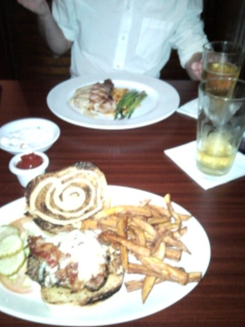 I believe TasteBud A shares my feelings about the appetizer.  My main course was “smokey mountain burger bacon, smoked gouda with chipotle aioli on a toasted Kaiser.”  I couldn’t taste the gouda or the aioli.  It was well cooked (as ordered).  I felt like it was a regular ol’ burger.