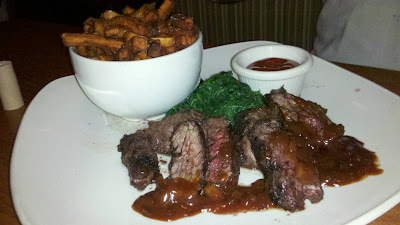 Although when we called the waitress didn’t give us a warm fuzzy, when we arrived we looked around a cozy dining room with a very relaxed crowd. If the weather were better, we may have sat at the inviting outside seating. Cornerstone offers a seasonal menu with the summer menu lasting through the end of September. TasteBud A ordered the Hanger Steak with sweet potato fries, garlic spinach with a peach bbq sauce. I ordered the Chicken Capitavi.